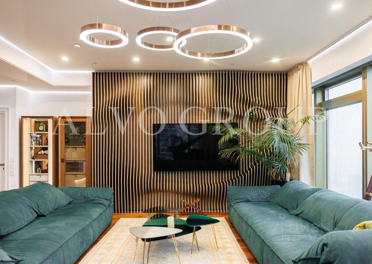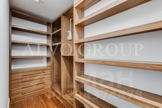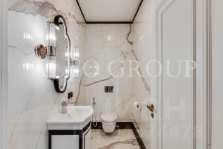 Квартира разработана с учетом самых высоких стандартов комфорта. В отделке использованы натуральные материалы: дубовая инженерная доска, мрамор, крупноформатный керамогранит, шпон ценных пород дерева.