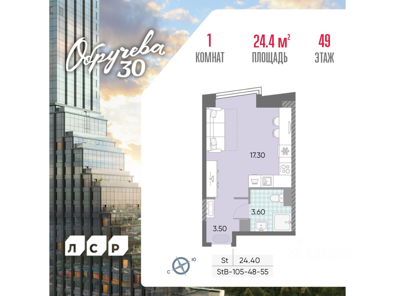 Продается квартира-студия общей площадью 24.4 кв. метров на 49 этаже дома бизнес-класса "Обручева 30". Дом располагается в 5 минутах ходьбы до станции метро "Калужская" и 10 минутах до станции метро "Воронцовская". Для автомобилистов удобный и быстрый выезд на улицы Обручева и Профсоюзную.