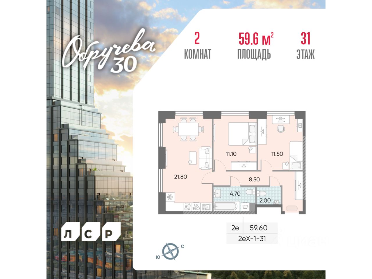 Продается 2-комнатная квартира общей площадью 59.6 кв. метров на 31 этаже дома бизнес-класса "Обручева 30". Дом располагается в 5 минутах ходьбы до станции метро "Калужская" и 10 минутах до станции метро "Воронцовская". Для автомобилистов удобный и быстрый выезд на улицы Обручева и Профсоюзную.