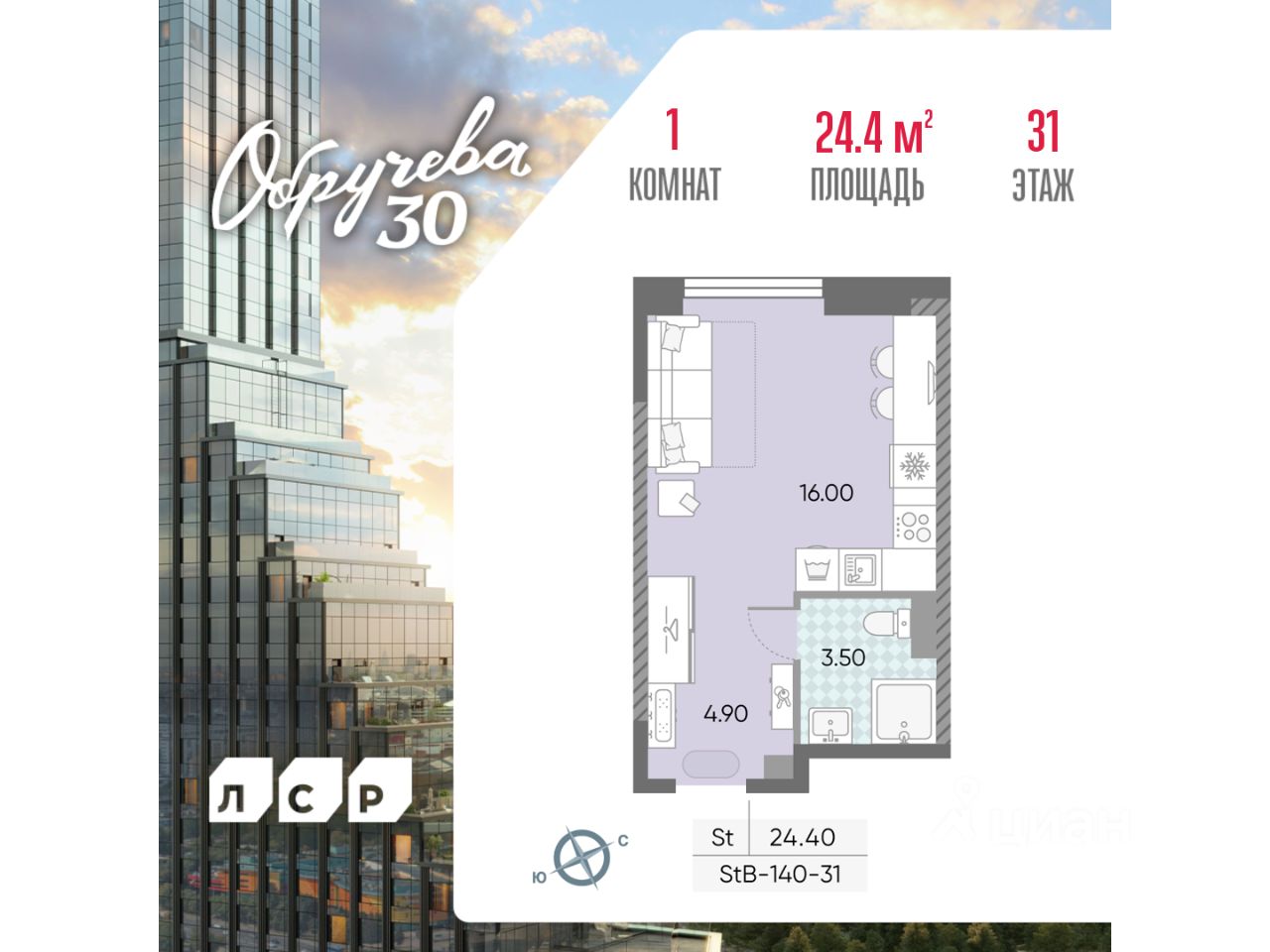 Продается квартира-студия общей площадью 24.4 кв. метров на 31 этаже дома бизнес-класса "Обручева 30". Дом располагается в 5 минутах ходьбы до станции метро "Калужская" и 10 минутах до станции метро "Воронцовская". Для автомобилистов удобный и быстрый выезд на улицы Обручева и Профсоюзную.