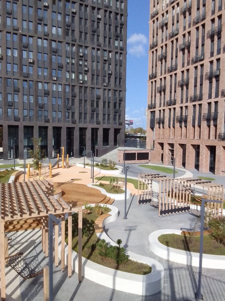 В корпусах просторное двухуровневое лобби с лаунж-зоной, мягкими диванами. В приватном дворе ландшафтное озеленение и зоны для детей, спорта и отдыха.