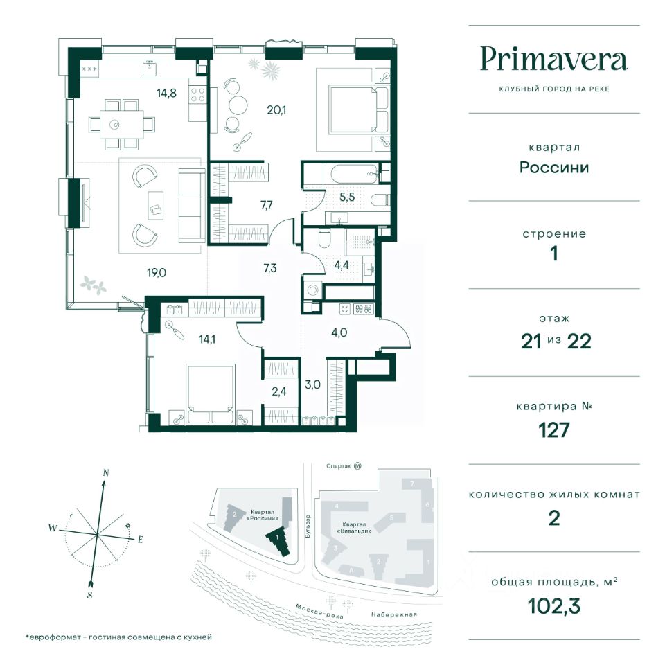 Клубный город на реке Primavera — это современный жилой комплекс премиум-класса, расположенный на первой береговой линии Москвы-реки в экологически чистом районе Покровское-Стрешнево. Под панорамными окнами квартир находится собственный экопарк с продуманной сетью прогулочных дорожек и современными детскими и спортивными площадками. За парком расположена набережная с собственным пляжем и зонами для отдыха. Клубный город на реке Primavera предлагает широкий выбор планировок для различных жизненных сценариев: от просторных однокомнатных квартир до пентхаусов и жилых помещений с террасами и патио. Выберите из 120 вариантов эргономичных планировок стандартного и евроформата. Из каждой квартиры открываются красивые виды на реку с углом обзора в 270 градусов. Дизайнерские лобби предлагают панорамный обзор на благоустроенный двор. Высокие потолки в 6 метров и качественная отделка создают атмосферу, схожую с пятизвездочными отелями. В Primavera есть всё необходимое для комфортной жизни в мегаполисе: • Образование для детей в шаговой доступности: 4 школы, 8 детских садов и развивающие центры с кружками и секциями. • Удобства на расстоянии приятной прогулки: супермаркеты, кафе, рестораны с верандами, салоны красоты, аптеки и многофункциональный центр для шоппинга и развлечений. • Умный дом: автоматизированное бесконтактное управление основными системами доступа и безопасности через мобильное приложение. Клубный город на реке Primavera выгодно сочетает комфорт городской жизни с близостью к природе. Живите в месте, где все создано для вашего удобства!