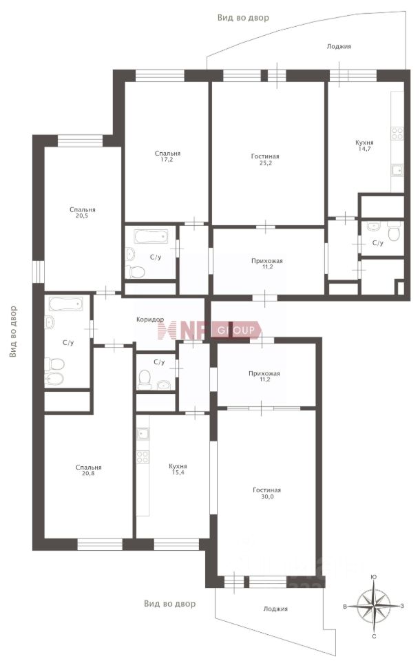 Планировка: гостиная с зоной кухни и выходом на лоджию с видом на озеро, 3 спальни, кабинет, 3 с/у, гардеробная, постирочная.