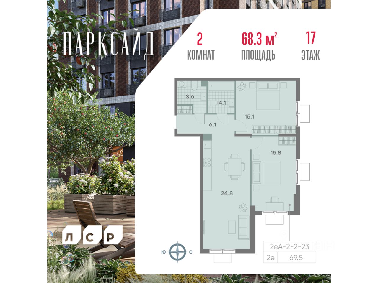Продаётся 2-комнатная квартира общей площадью 68.3 кв. метров на 17 этаже жилого квартала Парксайд. Возводится в районе Чертаново Центральное Южного административного округа Москвы. В 2 км от будущего комплекса находится станция метро "Пражская". Для автомобилистов есть удобные выезды на Варшавское шоссе и Чертановскую улицу.