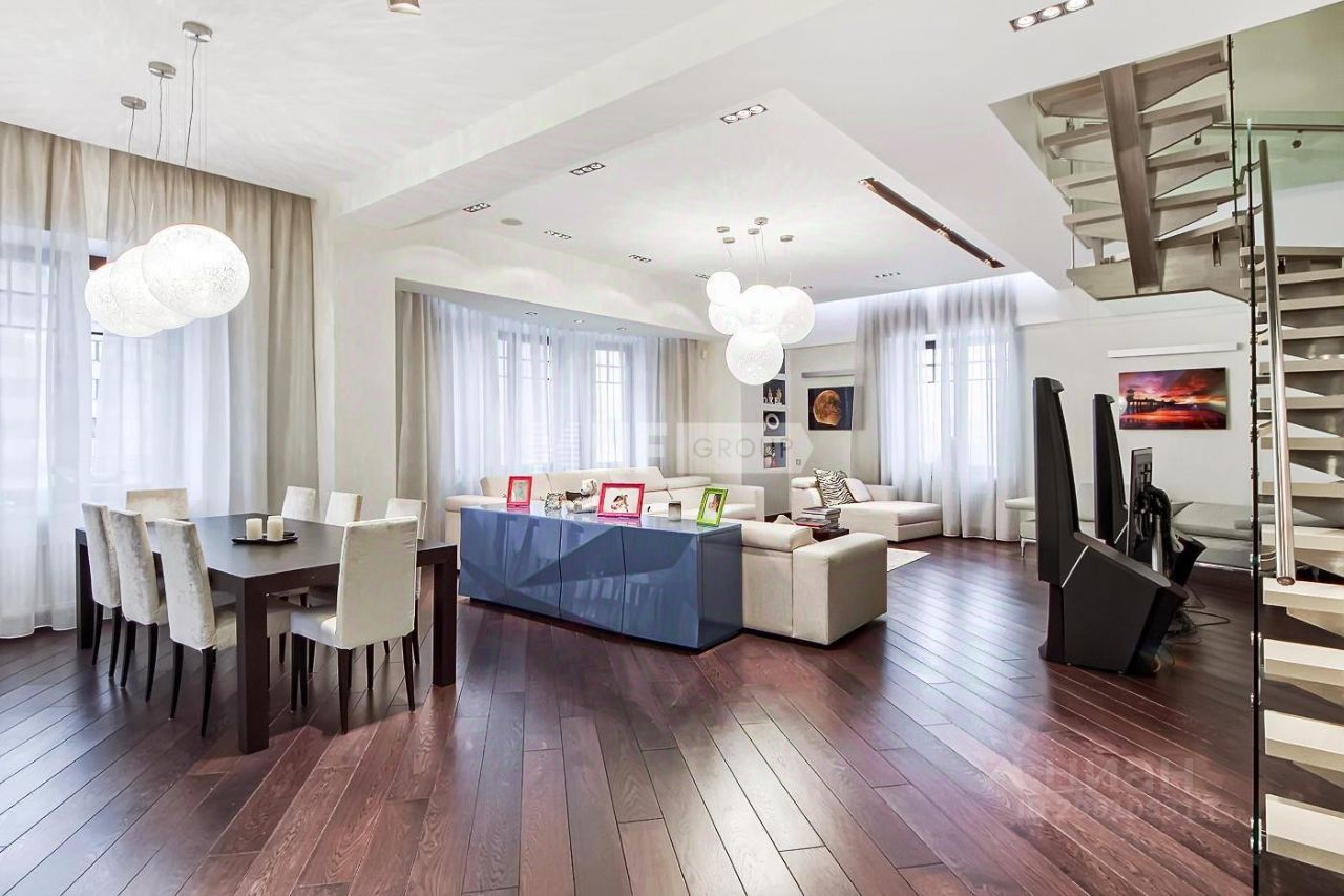 Лот: 38534. Эксклюзивный трёхуровневый пентхаус под ключ с террасой в клубном жилом комплексе "Венский дом" предлагает уникальное сочетание роскоши, пространства и панорамных видов. Расположенный на последних этажах 9-этажной секции, пентхаус открывает потрясающие виды на храм Христа Спасителя, высотки Москвы и ММДЦ "Москва-Сити". Общая площадь апартаментов составляет 340 кв.м, площадь террасы - 86 кв.м.