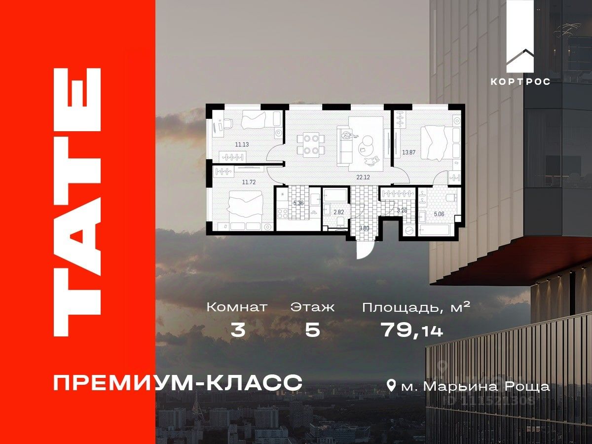 Продается 3-комнатная квартира от застройщика в ЖК премиум-класса TATE на 5 этаже. Общая площадь 79,14 м². Отделка предчистовая (white box). 2 санузла. Вид из окна на Тимирязевский парк, Парк Останкино/ВДНХ. Угловое остекление. Мастер-спальня. Гардеробная. Башня A.