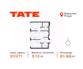 Продается 2-комнатная квартира от застройщика в ЖК премиум-класса TATE на 25 этаже. Общая площадь 61,66 м². Отделка предчистовая (white box). 2 санузла. Вид из окна на Парк Сокольники, Москва Сити. Угловое остекление. Мастер-спальня. Башня A.
