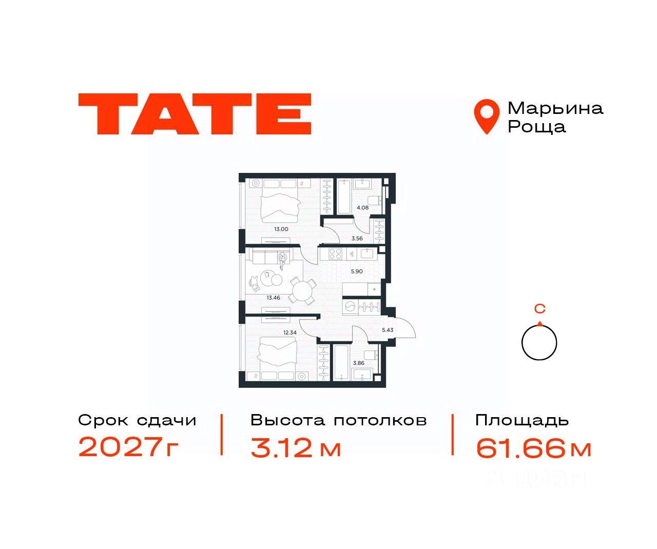 Продается 2-комнатная квартира от застройщика в ЖК премиум-класса TATE на 27 этаже. Общая площадь 61,66 м². Отделка предчистовая (white box). 2 санузла. Вид из окна на Парк Сокольники, Москва Сити. Угловое остекление. Мастер-спальня. Башня A.