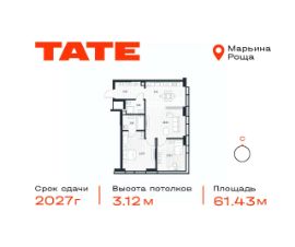 Продается 2-комнатная квартира от застройщика в ЖК премиум-класса TATE на 29 этаже. Общая площадь 61,43 м². Отделка предчистовая (white box). 2 санузла. Вид из окна на Парк Сокольники, Москва Сити. Угловое остекление. Мастер-спальня. Башня A.