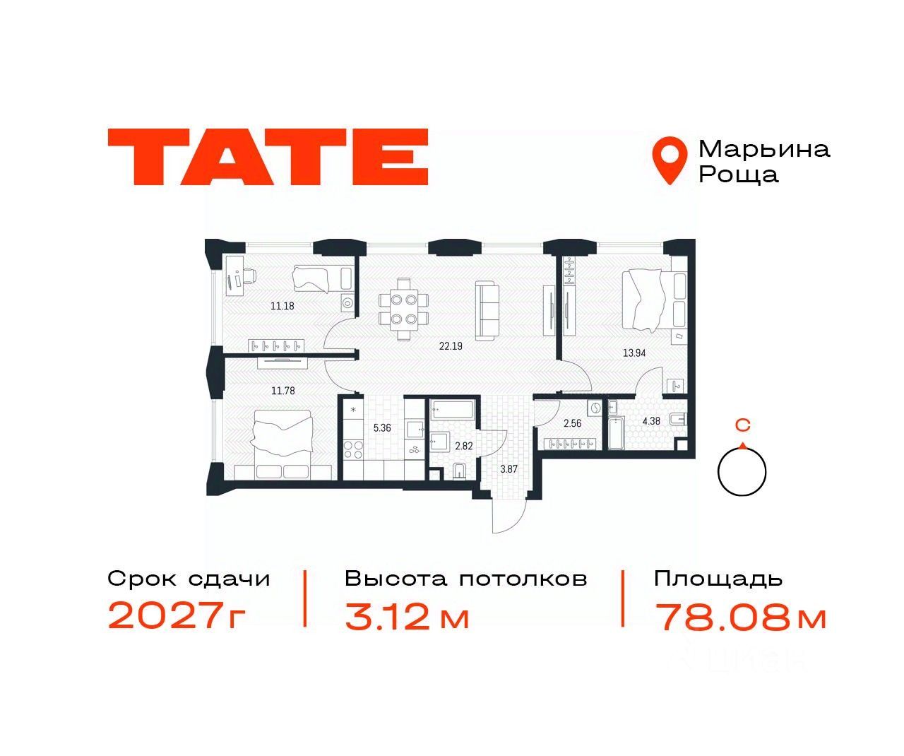 Продается 3-комнатная квартира от застройщика в ЖК премиум-класса TATE на 29 этаже. Общая площадь 78,08 м². Отделка предчистовая (white box). 2 санузла. Вид из окна на Тимирязевский парк, Парк Останкино/ВДНХ. Угловое остекление. Мастер-спальня. Гардеробная. Башня A.