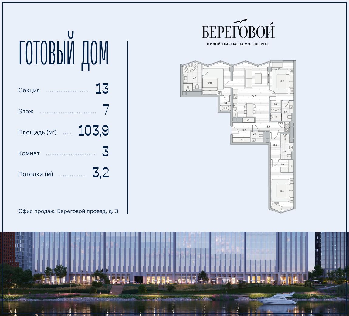 Река. Парк. Сити. Готовый дом в идеальном месте. Продается 3-комнатная квартира на 7 этаже с панорамным остеклением и видом на Береговой пр-д. Береговой — квартал-курорт в центре столицы. Готовый дом на первой линии Москвы-реки. Пешеходная набережная начинается прямо от дома — никаких дорог между вами и рекой. Уникальное сочетание природы парка Фили и ритма Сити. Ключи от нового образа жизни в Береговом: • 12 террас на крышах — ваши виды на Москву с высоты птичьего полета • Пешеходная набережная прямо у дома — ни одной машины между вами и рекой • Лобби с камином, переговорной и консьерж-сервисом • Флагманский Encore Fitness — самый большой в сети (4700 м²) с бассейном, термами и спа-комплексом • Детство на берегу Москвы-реки — в рамках проекта будут построены две школы и детский сад рядом с домом • Гастрономическая набережная: рестораны и премиум-сервисы откроются на первых этажах • Причал "Береговой" рядом с домом — путешествуйте по городу, пока другие стоят в пробках • Безопасность и уединение: контроль доступа на территорию, видеонаблюдение и круглосуточная диспетчерская • Двухуровневый подземный паркинг и кладовые Безупречная квартира для жизни: • Пространство света и воздуха: панорамные окна и высокие потолки 3.2 м • Технологии: центральное кондиционирование и роботизированная система очистки фасадов — вид из окна всегда будет идеальным • Совершенство планировки: просторная кухня-гостиная, минимум коридоров, максимум полезной площади • Квартира без отделки — возможность раскрыть преимущества планировки в вашем уникальном интерьере. Или выбирайте свою версию идеального дома в коллекции планировок: • С изолированными спальнями • Мастер-спальнями с гардеробными и ванными • Видовые ванные комнаты • Функциональные постирочные Эксклюзивные лоты: • Пентахусы с приватными террасами • Двухуровневые пентхаусы Локация, о которой мечтают 15 минут до Сити на машине — и вы в эпицентре деловой жизни. Две станции метро в пешей доступности — когда каждая минута на счету. Утром — пробежка по парку Фили, вечером — прогулка на велосипеде вдоль реки, выходные — водный спорт в Крылатском. Речные трамвайчики вместо такси, зеленые парки и благоприятная экология — привилегии престижного ЗАО Москвы. Условия покупки: выгодные программы покупки от застройщика, специальные условия при полной оплате. Оставляйте заявку на персональную презентацию в шоу-руме.