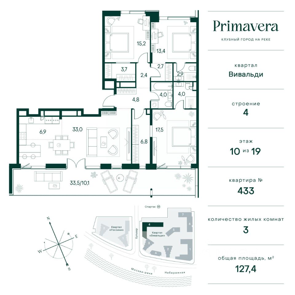 Клубный город на реке Primavera — это респектабельный проект премиум-класса на первой береговой линии Москвы-реки в экологически безупречном районе — Покровское-Стрешнево. Под панорамными окнами квартир расположился собственный экопарк, площадью 12 гектаров с сетью прогулочных дорожек, оборудованный детскими и спортивными площадками, а за ним набережная с собственным пляжем и зонами отдыха. Клубный город на реке Primavera предлагает впечатляющий выбор планировок для любого жизненного сценария: от просторных однокомнатных квартир до пентхаусов и квартир с видовыми террасами или патио. Выбирайте из 120 вариантов эргономичных планировок стандартного и евроформата. В проекте доступны квартиры площадью от 40 до 209 м², в каждой из которых открываются непревзойденные виды на реку, а угол обзора составляет 270 градусов. Из дизайнерских лобби открывается панорамный обзор на зеленый благоустроенный двор. Статусное мебелирование, потолки высотой 6 м и комфортная лаунж-зона отсылают к стилистике высококлассных пятизвездочных отелей. В Primavera есть все, что может предложить мегаполис, здесь все сосредоточено вокруг вас и настроено на ваши желания: - Всестороннее детское развитие в паре шагов от дома: 4 школы, 8 детских садов, развивающие центры с кружками и секциями. - Комфорт мегаполиса на расстоянии приятной прогулки: супермаркеты, кафе, рестораны с верандами на крыше, салоны красоты, аптеки, компании сферы услуг, многофункциональный центр для шоппинга и развлечений. - Умный дом: автоматизированное бесконтактное управление основными системами доступа, инфраструктуры и безопасности через мобильное приложение и специальные метки. Клубный город на реке Primavera выгодно отличается близостью к природе, совмещенной с насыщенной инфраструктурой.