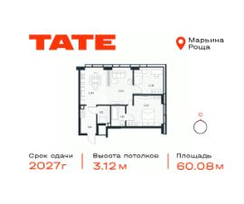 Продается 2-комнатная квартира от застройщика в ЖК премиум-класса TATE на 30 этаже. Общая площадь 60,08 м². Отделка предчистовая (white box). 2 санузла. Вид из окна на Парк Останкино/ВДНХ, Парк Сокольники. Угловое остекление. Мастер-спальня. Башня A.