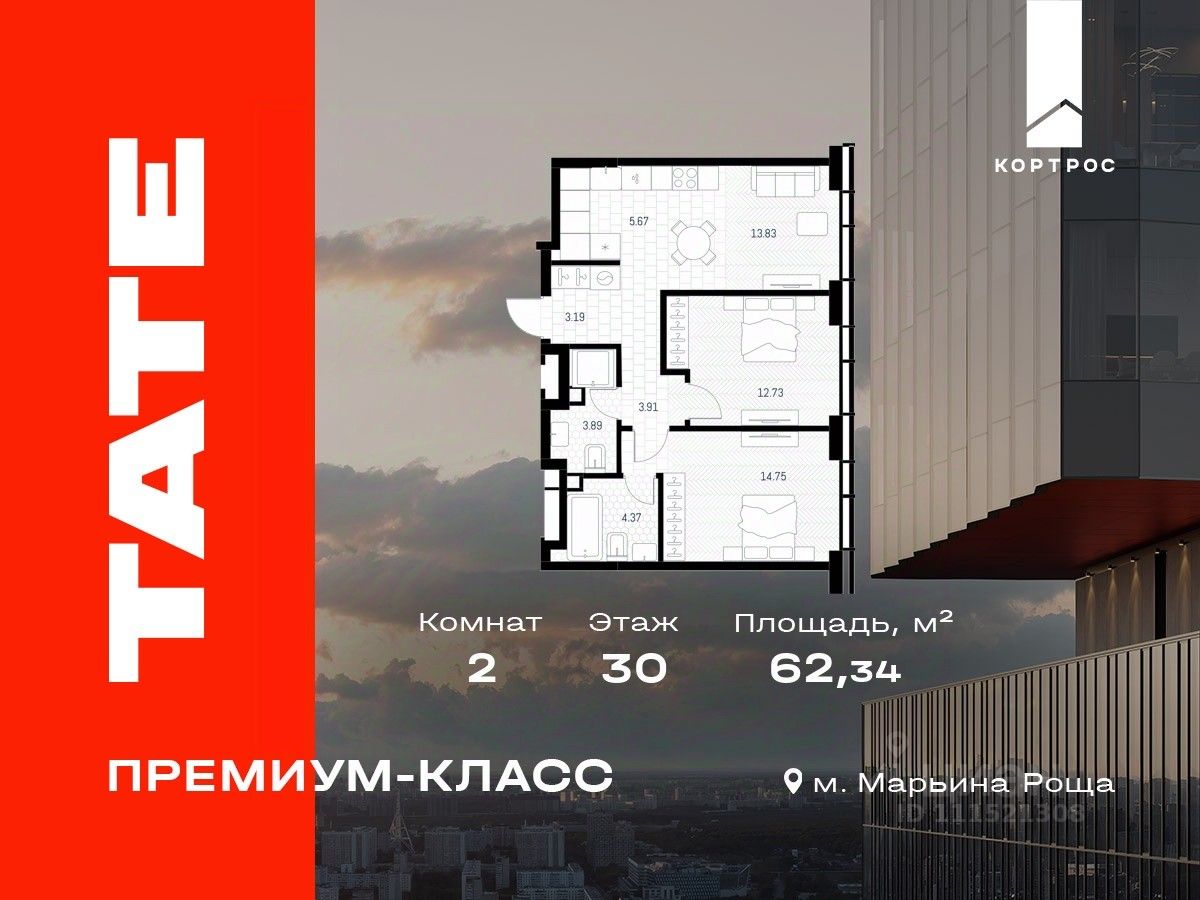 Продается 2-комнатная квартира от застройщика в ЖК премиум-класса TATE на 30 этаже. Общая площадь 62,34 м². Отделка предчистовая (white box). 2 санузла. Вид из окна на Парк Сокольники. Мастер-спальня. Башня A.
