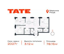 Продается 3-комнатная квартира от застройщика в ЖК премиум-класса TATE на 30 этаже. Общая площадь 78,15 м². Отделка предчистовая (white box). 2 санузла. Вид из окна на Тимирязевский парк, Парк Останкино/ВДНХ. Угловое остекление. Мастер-спальня. Гардеробная. Башня A.
