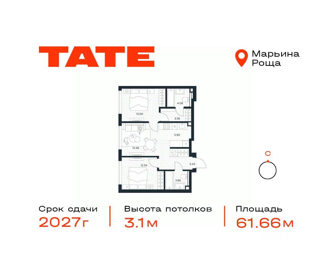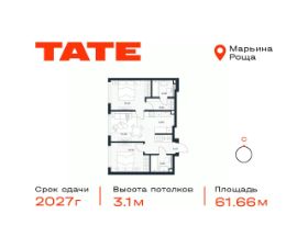 Продается 2-комнатная квартира от застройщика в ЖК премиум-класса TATE на 35 этаже. Общая площадь 61,66 м². Отделка предчистовая (white box). 2 санузла. Вид из окна на Парк Сокольники, Москва Сити. Угловое остекление. Мастер-спальня. Башня A.