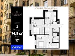Площадь квартиры составляет 74,80 кв.м и находится на 17-ом этаже 24-этажного здания. Концепция комплекса вдохновлена театральной тематикой, предлагая сочетание неоклассической архитектуры с оригинальной отделкой холлов, изысканными фасадами и созданием культурно-просветительского пространства.