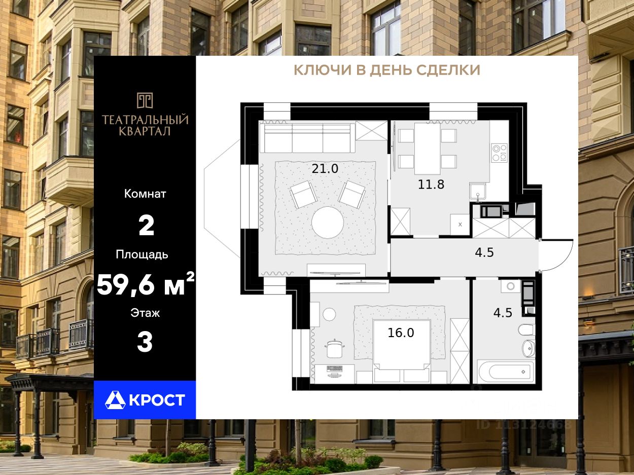 Площадь квартиры составляет 59,60 кв.м и находится на 3-ом этаже 19-этажного здания. Концепция комплекса вдохновлена театральной тематикой, предлагая сочетание неоклассической архитектуры с оригинальной отделкой холлов, изысканными фасадами и созданием культурно-просветительского пространства.