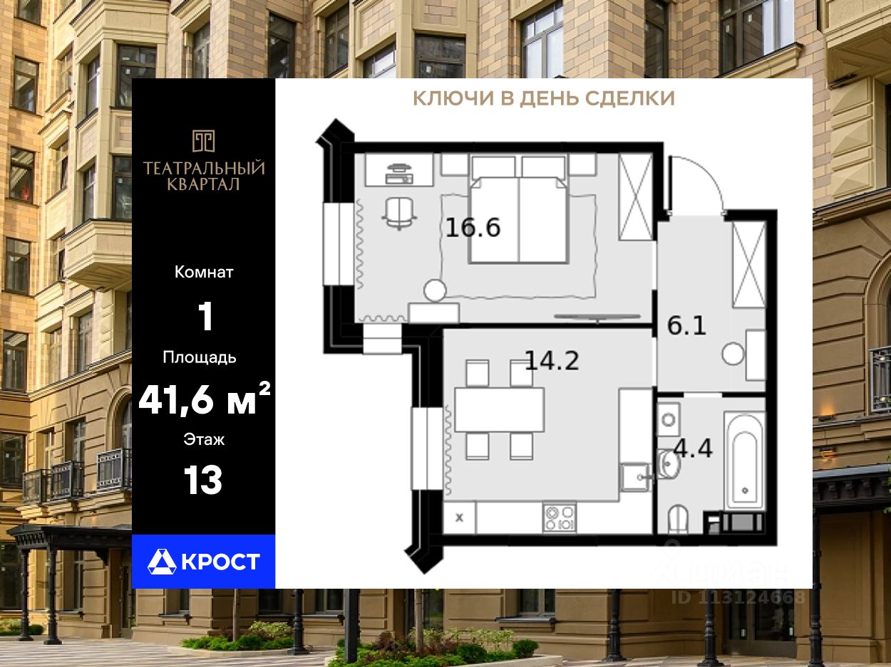 Площадь квартиры составляет 41,60 кв.м и находится на 13-ом этаже 19-этажного здания. Концепция комплекса вдохновлена театральной тематикой, предлагая сочетание неоклассической архитектуры с оригинальной отделкой холлов, изысканными фасадами и созданием культурно-просветительского пространства.