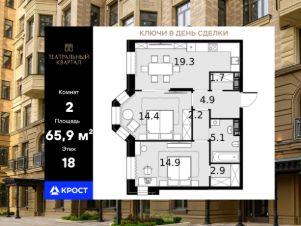 Площадь квартиры составляет 65,90 кв.м и находится на 18-ом этаже 19-этажного здания. Концепция комплекса вдохновлена театральной тематикой, предлагая сочетание неоклассической архитектуры с оригинальной отделкой холлов, изысканными фасадами и созданием культурно-просветительского пространства.