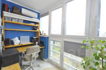 Утеплённая лоджия с панорамным остеклением, оборудована под кабинет или зону отдыха.