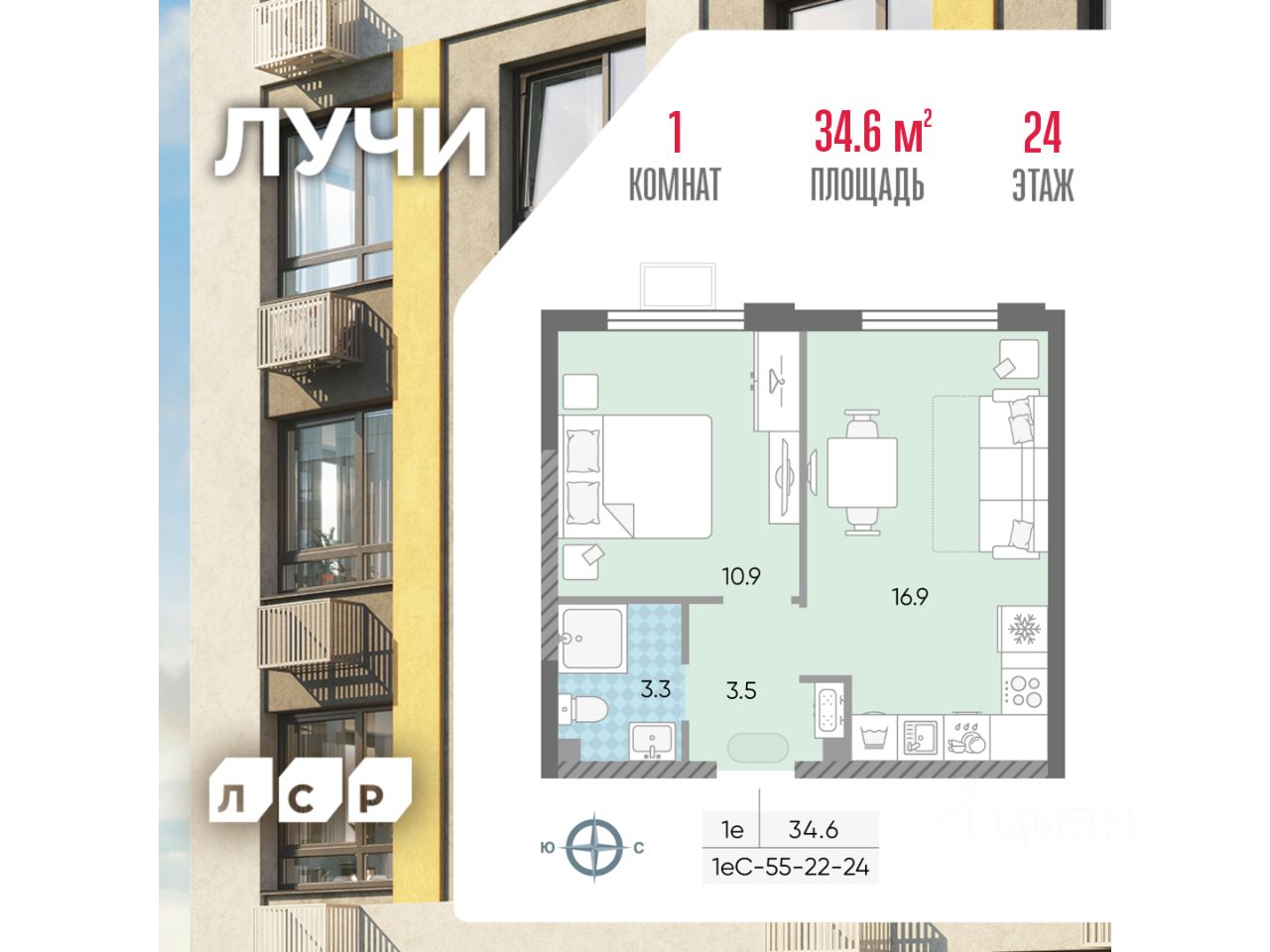 Продается 1-комнатная квартира общей площадью 34.6 кв. метров на 24 этаже жилого комплекса Лучи.