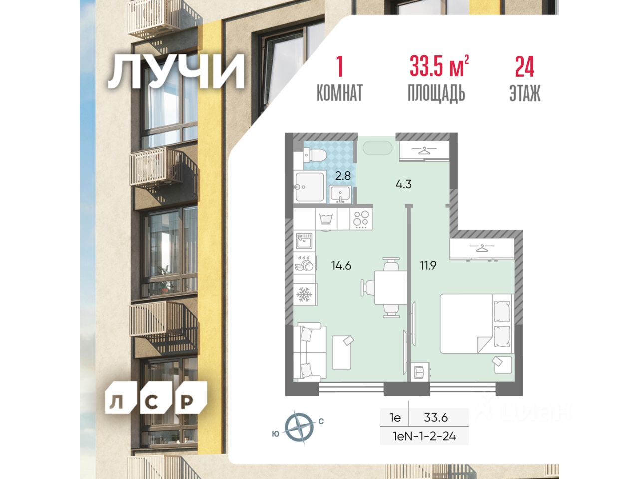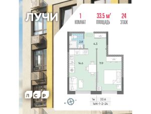 Продается 1-комнатная квартира общей площадью 33.5 кв. метров на 24 этаже жилого комплекса Лучи.