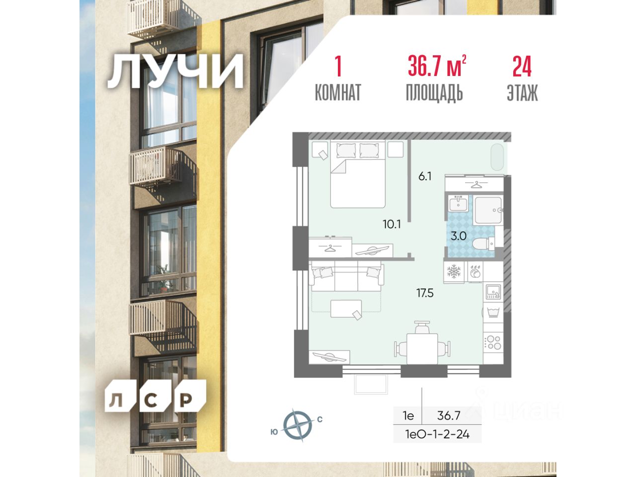Продается 1-комнатная квартира общей площадью 36.7 кв. метров на 24 этаже жилого комплекса Лучи.