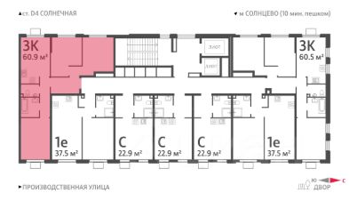 Продается 3-комнатная квартира общей площадью 60.9 кв. метров на 22 этаже жилого комплекса Лучи.