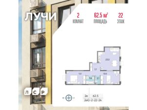 Продается 2-комнатная квартира общей площадью 62.5 кв. метров на 22 этаже жилого комплекса Лучи.
