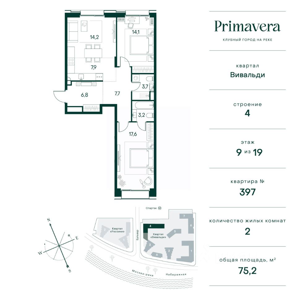 Клубный город на реке Primavera — это современный жилой комплекс премиум-класса, расположенный на первой береговой линии Москвы-реки в экологически чистом районе Покровское-Стрешнево. Под панорамными окнами квартир находится собственный экопарк с продуманной сетью прогулочных дорожек и современными детскими и спортивными площадками. За парком расположена набережная с собственным пляжем и зонами для отдыха. Клубный город на реке Primavera предлагает широкий выбор планировок для различных жизненных сценариев: от просторных однокомнатных квартир до пентхаусов и жилых помещений с террасами и патио. Выберите из 120 вариантов эргономичных планировок стандартного и евроформата. Из каждой квартиры открываются красивые виды на реку с углом обзора в 270 градусов. Дизайнерские лобби предлагают панорамный обзор на благоустроенный двор. Высокие потолки в 6 метров и качественная отделка создают атмосферу, схожую с пятизвездочными отелями. В Primavera есть всё необходимое для комфортной жизни в мегаполисе: • Образование для детей в шаговой доступности: 4 школы, 8 детских садов и развивающие центры с кружками и секциями. • Удобства на расстоянии приятной прогулки: супермаркеты, кафе, рестораны с верандами, салоны красоты, аптеки и многофункциональный центр для шоппинга и развлечений. • Умный дом: автоматизированное бесконтактное управление основными системами доступа и безопасности через мобильное приложение. Клубный город на реке Primavera выгодно сочетает комфорт городской жизни с близостью к природе. Живите в месте, где все создано для вашего удобства!
