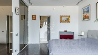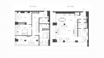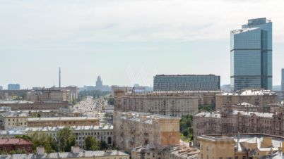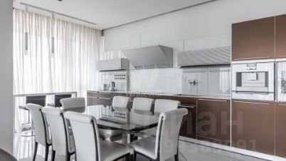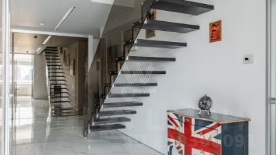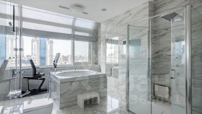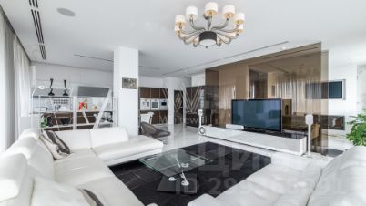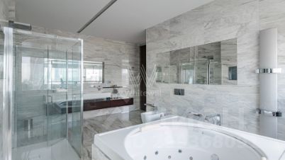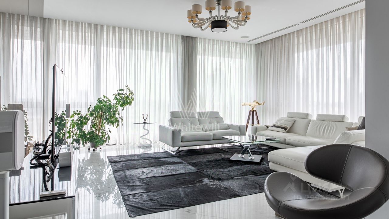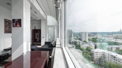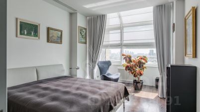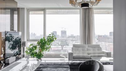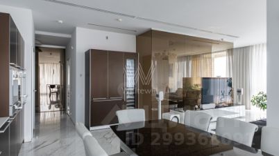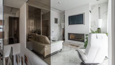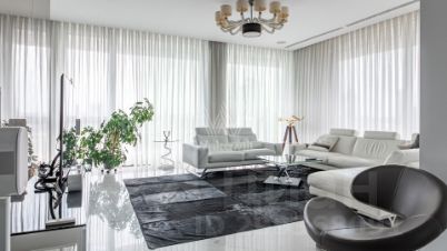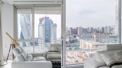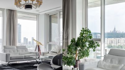 Видовой двухуровневый пентхаус в комплексе премиум-класса на Кутузовском проспекте напротив "Москва-Сити". Квартира площадью 220 м² с дровяным камином расположена на 14-15 этажах. Выполнен новый дизайнерский ремонт в современном стиле. Интерьер оформлен в белоснежных тонах с контрастными тёмными акцентами. На полу выложена доска из натурального дерева и итальянский мрамор. В квартире много света за счёт высоких потолков и сплошного панорамного остекления.