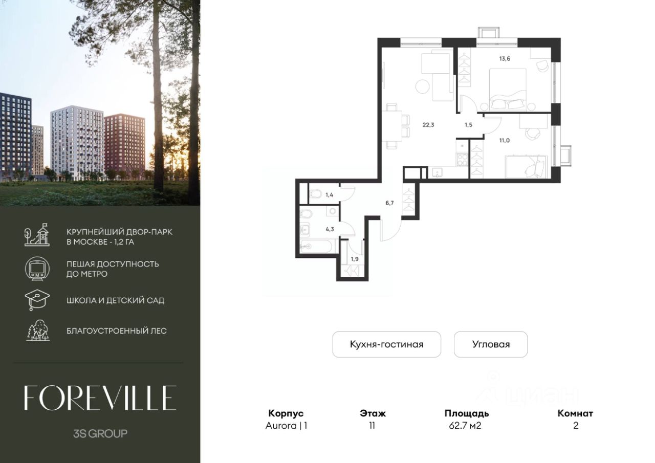 Продается уютная 2-комн. квартира площадью 62,7 кв.м на 11 этаже 17 этажного жилого комплекса бизнес-класса Foreville от 3S Group.