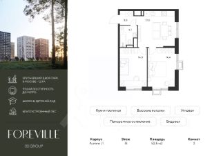 Продается уютная 2-комн. квартира площадью 52,5 кв.м на 15 этаже 17 этажного жилого комплекса бизнес-класса Foreville от 3S Group.