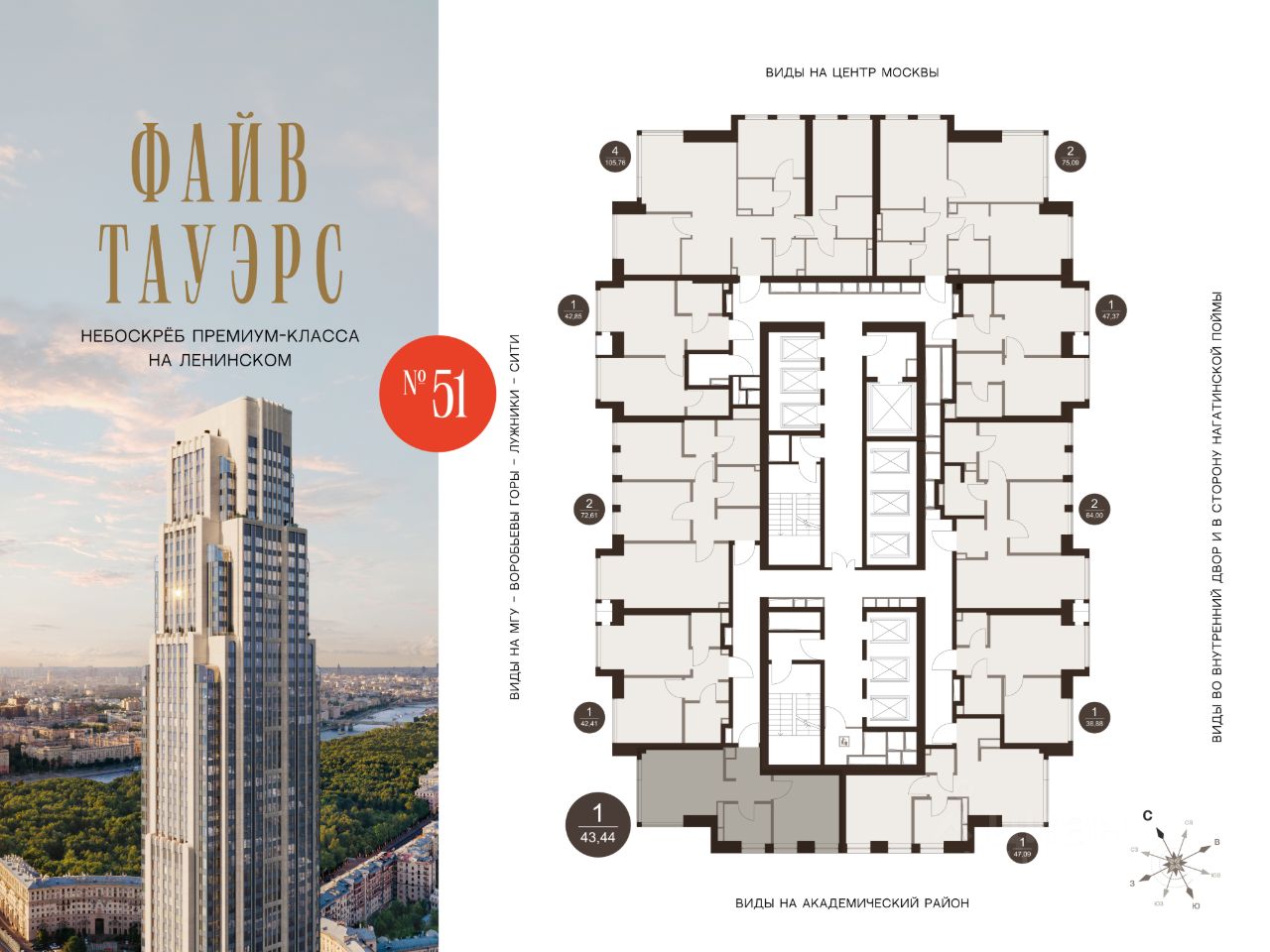 ФАЙВ ТАУЭРС — первый жилой небоскрёб на Ленинском проспекте и самый высокий дом столицы за пределами делового кластера "Москва-Сити". Премиальный небоскрёб представляет собой ультрасовременное, высокотехнологичное здание, идеальный синтез стилей культовых высоток Москвы и небоскребов Нью-Йорка и поражает воображение уникальными видами, монументальной роскошью и совершенством форм. Величественная панорама, открывающаяся из окон вашей квартиры, завораживает: легендарные сталинские высотки, шпиль главного корпуса МГУ, "Москва-Сити", спорткомплекс "Лужники".