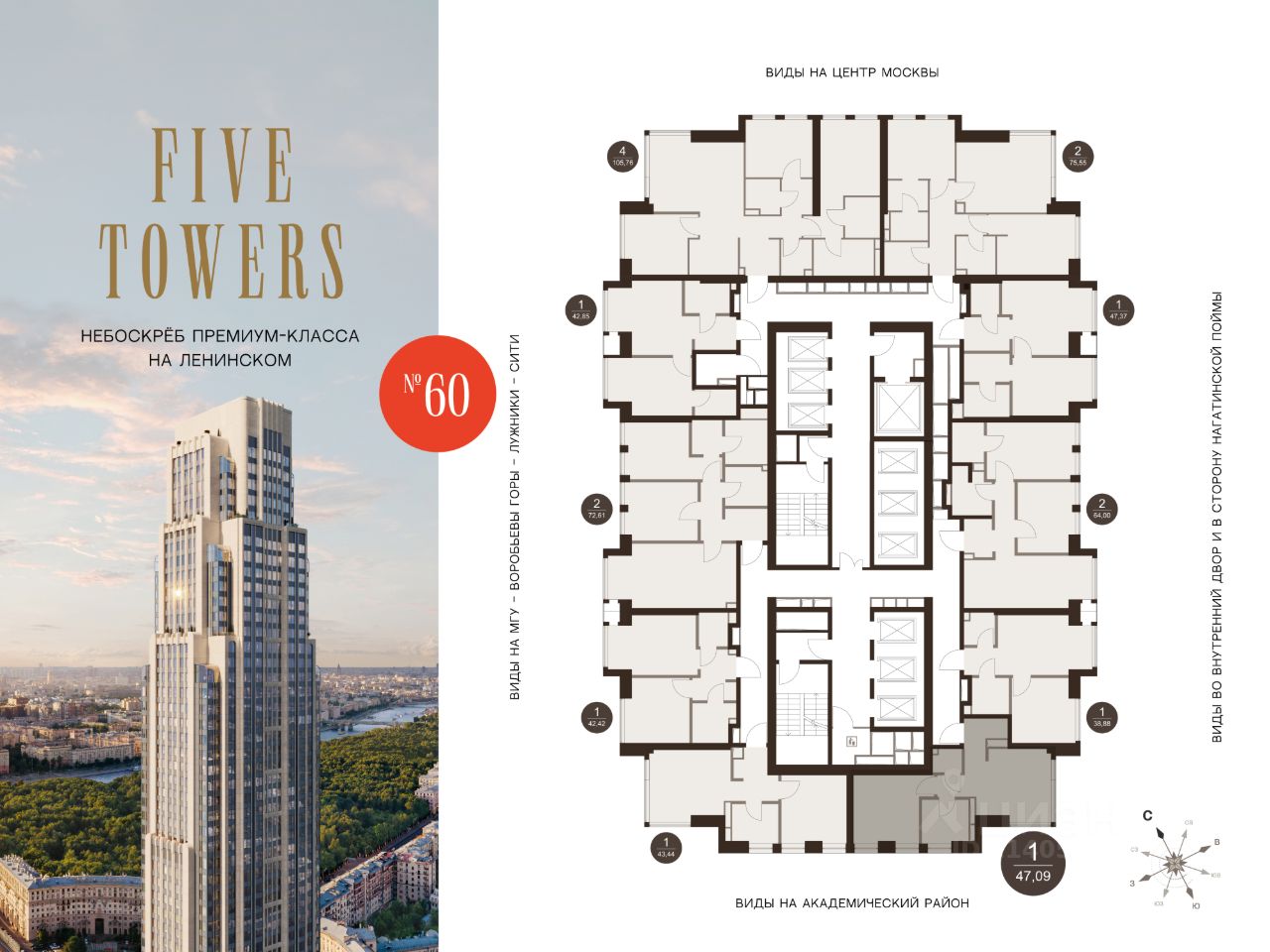 FIVE TOWERS — первый жилой небоскрёб на Ленинском проспекте и самый высокий дом столицы за пределами делового кластера "Москва-Сити". Премиальный небоскрёб представляет собой ультрасовременное, высокотехнологичное здание, идеальный синтез стилей культовых высоток Москвы и небоскребов Нью-Йорка и поражает воображение уникальными видами, монументальной роскошью и совершенством форм. Величественная панорама, открывающаяся из окон вашей квартиры, завораживает: легендарные сталинские высотки, шпиль главного корпуса МГУ, "Москва-Сити", спорткомплекс "Лужники".