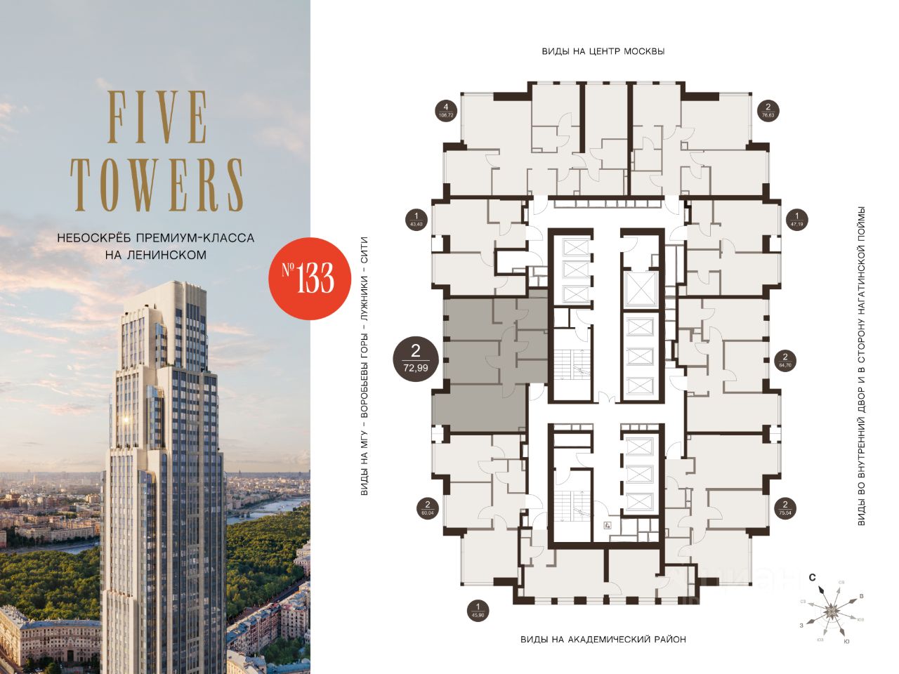 FIVE TOWERS — первый жилой небоскрёб на Ленинском проспекте и самый высокий дом столицы за пределами делового кластера "Москва-Сити". Премиальный небоскрёб представляет собой ультрасовременное, высокотехнологичное здание, идеальный синтез стилей культовых высоток Москвы и небоскребов Нью-Йорка и поражает воображение уникальными видами, монументальной роскошью и совершенством форм. Величественная панорама, открывающаяся из окон вашей квартиры, завораживает: легендарные сталинские высотки, шпиль главного корпуса МГУ, "Москва-Сити", спорткомплекс "Лужники".