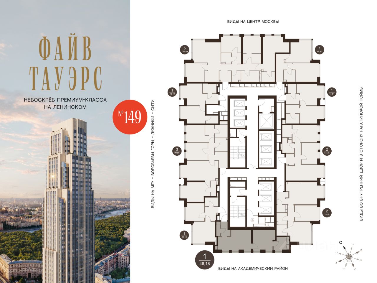 ФАЙВ ТАУЭРС — первый жилой небоскрёб на Ленинском проспекте и самый высокий дом столицы за пределами делового кластера "Москва-Сити". Премиальный небоскрёб представляет собой ультрасовременное, высокотехнологичное здание, идеальный синтез стилей культовых высоток Москвы и небоскребов Нью-Йорка и поражает воображение уникальными видами, монументальной роскошью и совершенством форм. Величественная панорама, открывающаяся из окон вашей квартиры, завораживает: легендарные сталинские высотки, шпиль главного корпуса МГУ, "Москва-Сити", спорткомплекс "Лужники".