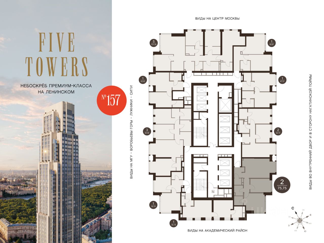 ФАЙВ ТАУЭРЗ — первый жилой небоскрёб на Ленинском проспекте и самый высокий дом столицы за пределами делового кластера "Москва-Сити". Премиальный небоскрёб представляет собой ультрасовременное, высокотехнологичное здание, идеальный синтез стилей культовых высоток Москвы и небоскребов Нью-Йорка и поражает воображение уникальными видами, монументальной роскошью и совершенством форм. Величественная панорама, открывающаяся из окон вашей квартиры, завораживает: легендарные сталинские высотки, шпиль главного корпуса МГУ, "Москва-Сити", спорткомплекс "Лужники".