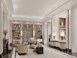 Архитектурное бюро Олега Клодта разработало дизайн общественных пространств ФАЙВ ТАУЭРЗ: гранд-лобби, камерную библиотеку c камином и лифтовую зону. Все необходимые сервисы сосредоточены на первых этажах небоскрёба: кафе, винотека, салон красоты, фитнес и детский клуб. Приватный Sky Club 49 — респектабельный лаундж с открытой террасой и ограниченным доступом на 49 этаже — только для резидентов.