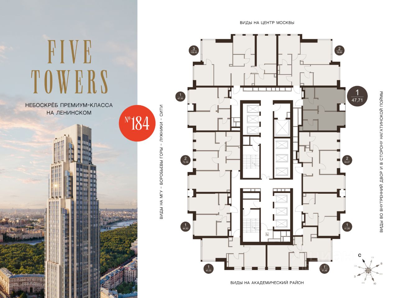 FIVE TOWERS — первый жилой небоскрёб на Ленинском проспекте и самый высокий дом столицы за пределами делового кластера "Москва-Сити". Премиальный небоскрёб представляет собой ультрасовременное, высокотехнологичное здание, идеальный синтез стилей культовых высоток Москвы и небоскребов Нью-Йорка и поражает воображение уникальными видами, монументальной роскошью и совершенством форм. Величественная панорама, открывающаяся из окон вашей квартиры, завораживает: легендарные сталинские высотки, шпиль главного корпуса МГУ, "Москва-Сити", спорткомплекс "Лужники".