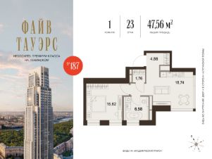 ФАЙВ ТАУЭРС — первый жилой небоскрёб на Ленинском проспекте и самый высокий дом столицы за пределами делового кластера "Москва-Сити". Премиальный небоскрёб представляет собой ультрасовременное, высокотехнологичное здание, идеальный синтез стилей культовых высоток Москвы и небоскребов Нью-Йорка и поражает воображение уникальными видами, монументальной роскошью и совершенством форм. Величественная панорама, открывающаяся из окон вашей квартиры, завораживает: легендарные сталинские высотки, шпиль главного корпуса МГУ, "Москва-Сити", спорткомплекс "Лужники".