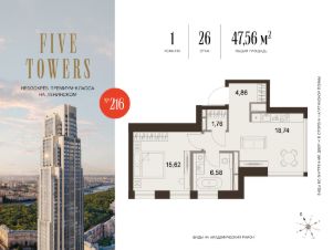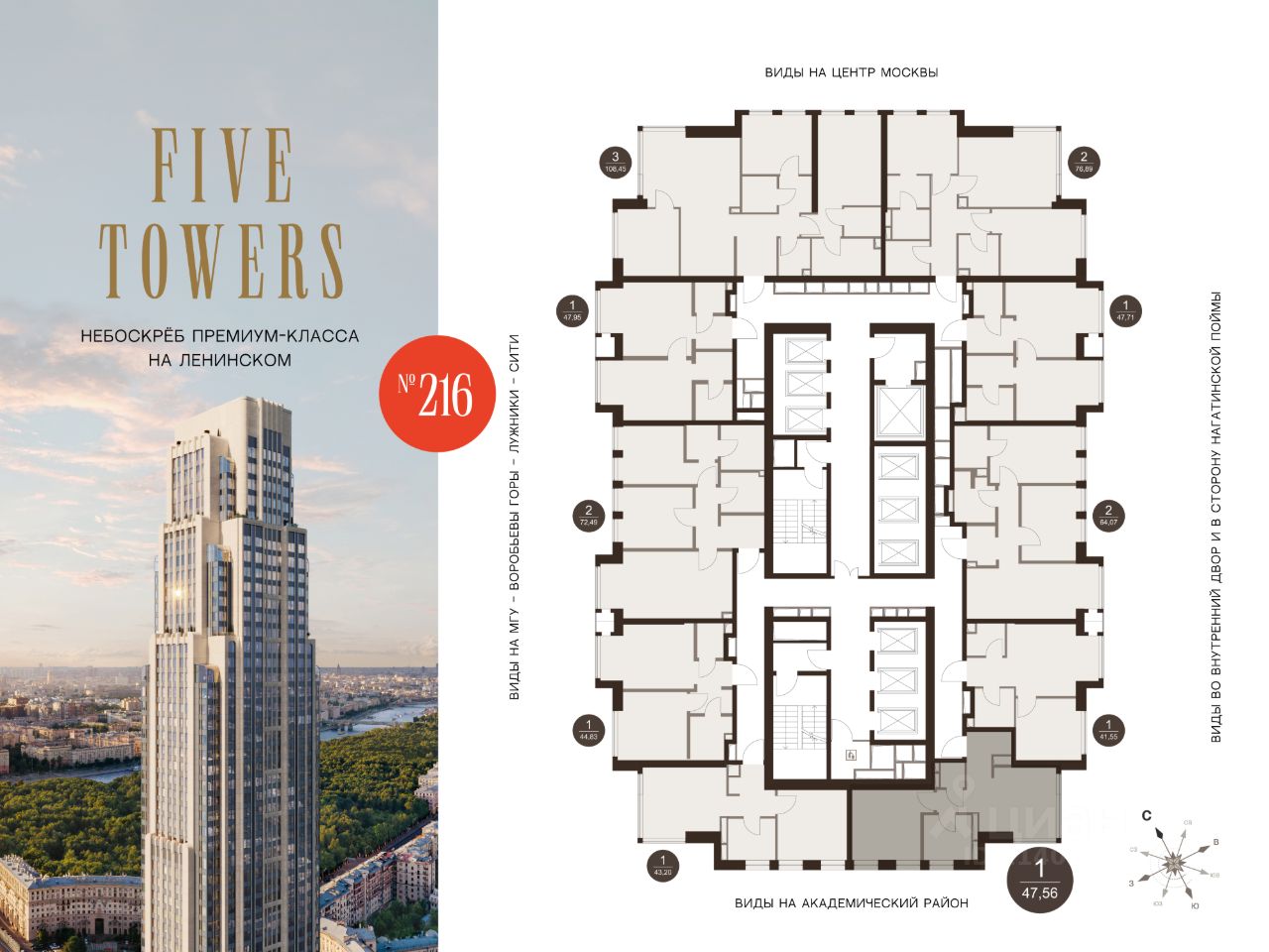 Гибкие программы рассрочки: 0% без переплат и удорожания; первый взнос от 10%. • Просторная однокомнатная квартира с угловым панорамным остеклением в кухне-гостиной • Функциональная планировка: квартира разделена на приватную и общую зоны • Изолированная вместительная гардеробная комната • Большая ванная комната с окном и нишей под стиральную и сушильную машины (площадь 6,58 кв. м) • Спальня с двумя панорамными окнами О проекте FIVE TOWERS — первый жилой небоскрёб на Ленинском проспекте и самый высокий дом столицы за пределами делового кластера "Москва-Сити". Премиальный небоскрёб представляет собой ультрасовременное, высокотехнологичное здание, идеальный синтез стилей культовых высоток Москвы и небоскребов Нью-Йорка и поражает воображение уникальными видами, монументальной роскошью и совершенством форм. Величественная панорама, открывающаяся из окон вашей квартиры, завораживает: легендарные сталинские высотки, шпиль главного корпуса МГУ, "Москва-Сити", спорткомплекс "Лужники". Окружение 75-этажный жилой комплекс премиум-класса расположен в историческом Донском районе. Транспортная инфраструктура проекта сделает жизнь резидентов FIVE TOWERS комфортной и продуманной: удобные выезды на ТТК и Садовое кольцо, 10 минут до метро "Ленинский проспект", 11 минут на МЦК до Москва-Сити. Рядом расположены крупные деловые и бизнес-центры, а в шаговой доступности — 500 га парков, образуемых Музеоном, Парком Горького и парком "Воробьевы горы". Инфраструктура Архитектурное бюро Олега Клодта разработало дизайн общественных пространств FIVE TOWERS: гранд-лобби, камерную библиотеку c камином и лифтовую зону. Все необходимые сервисы сосредоточены на первых этажах небоскрёба: кафе, винотека, салон красоты, фитнес и детский клуб. Приватный Sky Club 49 — респектабельный лаундж с открытой террасой и ограниченным доступом на 49 этаже — только для резидентов. Квартиры в FIVE TOWERS Все квартиры в FIVE TOWERS будут сданы с предчистовой отделкой (white box). Это позволит будущим резидентам комплекса сосредоточиться на творческой части ремонта, не связанной с организацией черновых работ. В жилом небоскребе FIVE TOWERS запланировано 596 премиальных квартир и 87 типов планировочных решений, которые можно адаптировать под личные запросы и сценарии проживания. В комплексе премиум-класса представлены не только двух- и трехкомнатные квартиры с угловым остеклением, но и однокомнатные с видом на две стороны и трехкомнатные квартиры с видами на три стороны, что является редким предложением на рынке недвижимости.