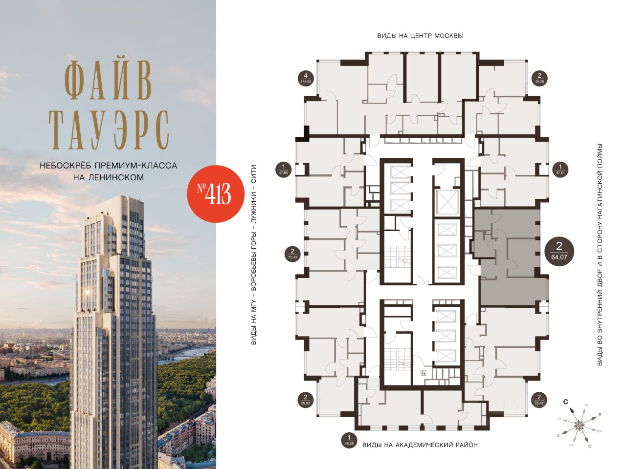 ФАЙВ ТАУЭРС — первый жилой небоскрёб на Ленинском проспекте и самый высокий дом столицы за пределами делового кластера "Москва-Сити". Премиальный небоскрёб представляет собой ультрасовременное, высокотехнологичное здание, идеальный синтез стилей культовых высоток Москвы и небоскребов Нью-Йорка и поражает воображение уникальными видами, монументальной роскошью и совершенством форм. Величественная панорама, открывающаяся из окон вашей квартиры, завораживает: легендарные сталинские высотки, шпиль главного корпуса МГУ, "Москва-Сити", спорткомплекс "Лужники".