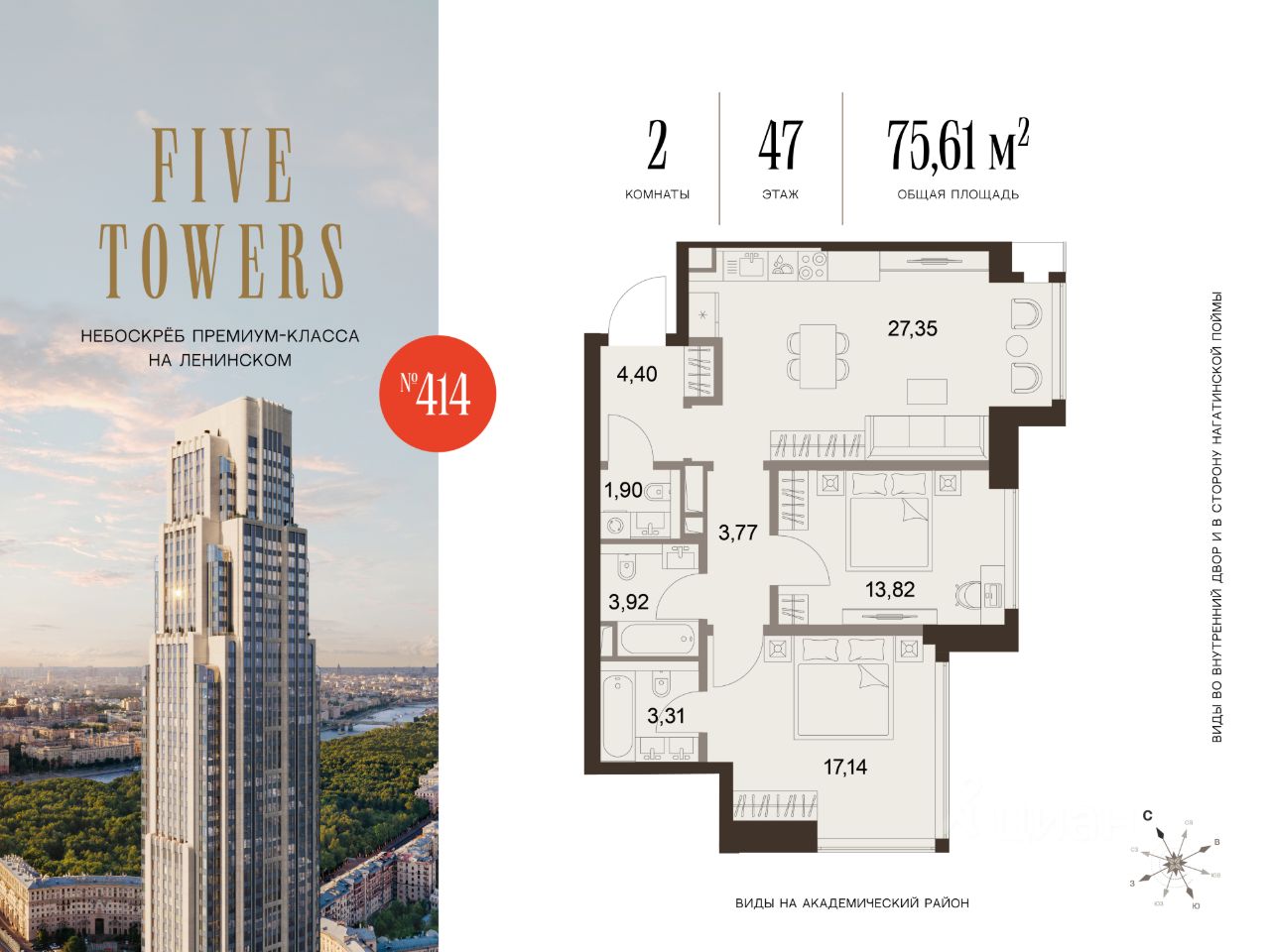 FIVE TOWERS — первый жилой небоскрёб на Ленинском проспекте и самый высокий дом столицы за пределами делового кластера "Москва-Сити". Премиальный небоскрёб представляет собой ультрасовременное, высокотехнологичное здание, идеальный синтез стилей культовых высоток Москвы и небоскребов Нью-Йорка и поражает воображение уникальными видами, монументальной роскошью и совершенством форм. Величественная панорама, открывающаяся из окон вашей квартиры, завораживает: легендарные сталинские высотки, шпиль главного корпуса МГУ, "Москва-Сити", спорткомплекс "Лужники".