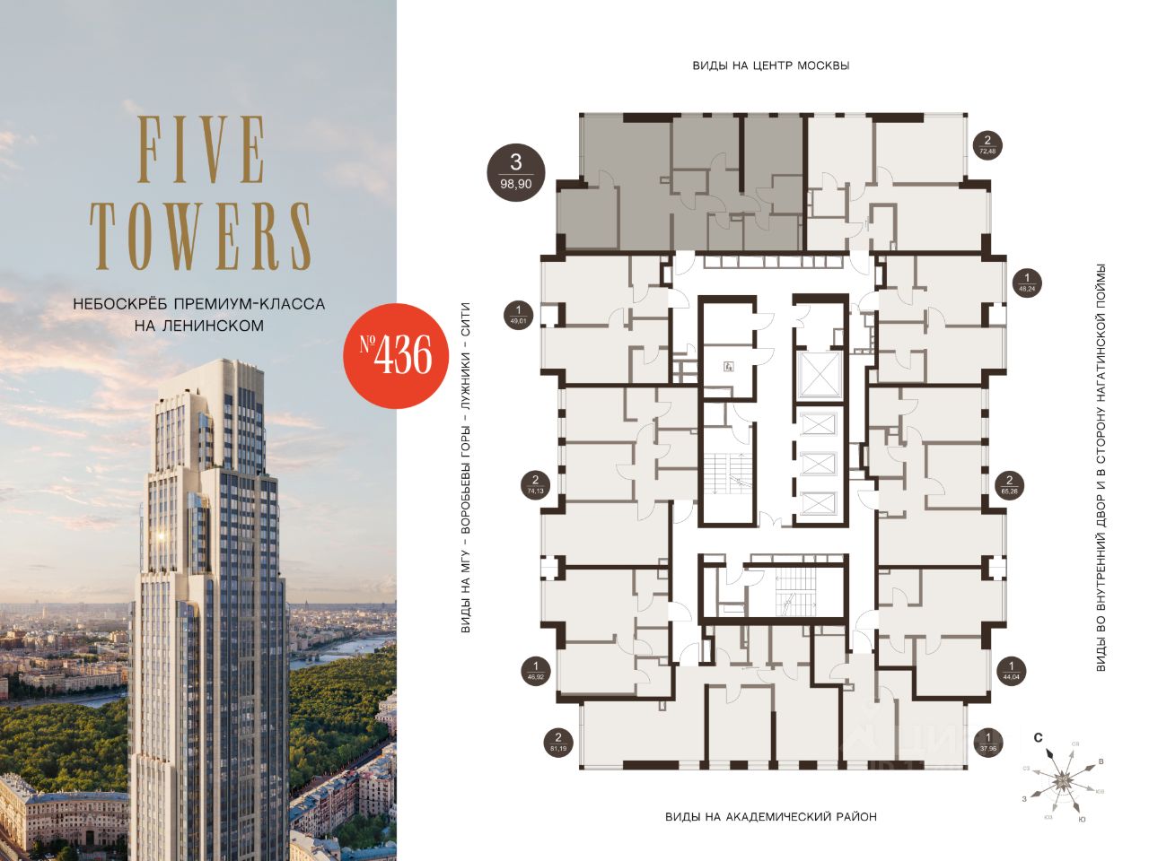 FIVE TOWERS — первый жилой небоскрёб на Ленинском проспекте и самый высокий дом столицы за пределами делового кластера "Москва-Сити". Премиальный небоскрёб представляет собой ультрасовременное, высокотехнологичное здание, идеальный синтез стилей культовых высоток Москвы и небоскребов Нью-Йорка и поражает воображение уникальными видами, монументальной роскошью и совершенством форм. Величественная панорама, открывающаяся из окон вашей квартиры, завораживает: легендарные сталинские высотки, шпиль главного корпуса МГУ, "Москва-Сити", спорткомплекс "Лужники".