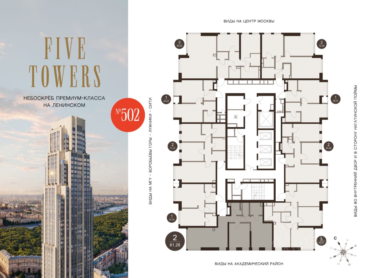 FIVE TOWERS — первый жилой небоскрёб на Ленинском проспекте и самый высокий дом столицы за пределами делового кластера "Москва-Сити". Премиальный небоскрёб представляет собой ультрасовременное, высокотехнологичное здание, идеальный синтез стилей культовых высоток Москвы и небоскребов Нью-Йорка и поражает воображение уникальными видами, монументальной роскошью и совершенством форм. Величественная панорама, открывающаяся из окон вашей квартиры, завораживает: легендарные сталинские высотки, шпиль главного корпуса МГУ, "Москва-Сити", спорткомплекс "Лужники".