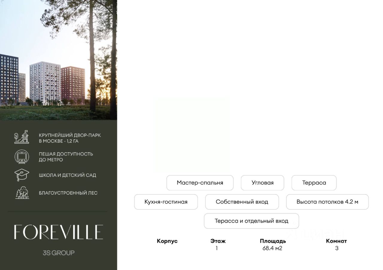Старт продаж! Продаётся 3-комнатная квартира 1 670 в ЖК Foreville. Foreville — это город в лесу (la ville dans la fort), объединяющий в уникальном балансе комфорт городской и загородной жизни: удобную инфраструктуру с ощущением покоя и умиротворения. Больше не придется задумываться о том, как бы выбраться на природу — вы живёте в самом ее сердце.