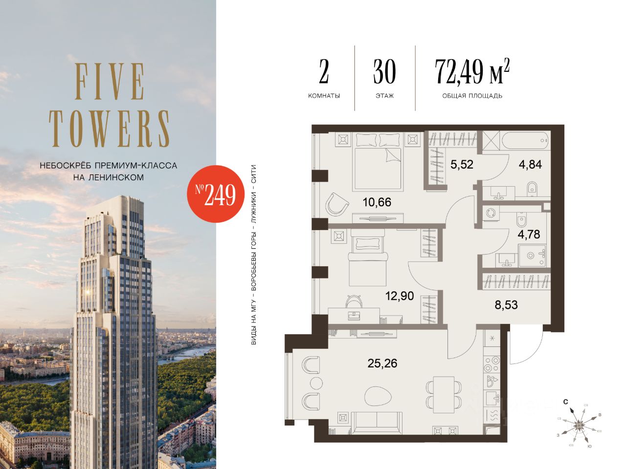 FIVE TOWERS — первый жилой небоскрёб на Ленинском проспекте и самый высокий дом столицы за пределами делового кластера "Москва-Сити". Премиальный небоскрёб представляет собой ультрасовременное, высокотехнологичное здание, идеальный синтез стилей культовых высоток Москвы и небоскребов Нью-Йорка и поражает воображение уникальными видами, монументальной роскошью и совершенством форм. Величественная панорама, открывающаяся из окон вашей квартиры, завораживает: легендарные сталинские высотки, шпиль главного корпуса МГУ, "Москва-Сити", спорткомплекс "Лужники".