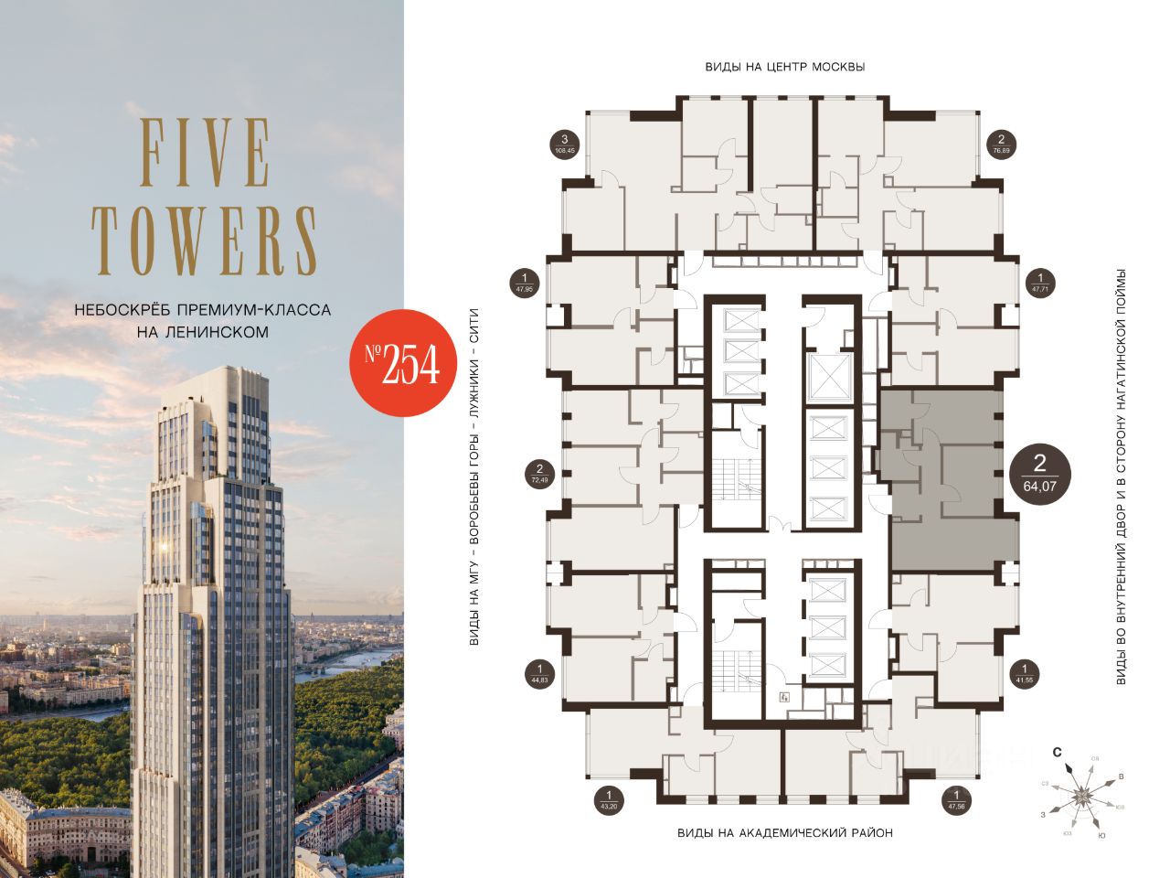 FIVE TOWERS — первый жилой небоскрёб на Ленинском проспекте и самый высокий дом столицы за пределами делового кластера "Москва-Сити". Премиальный небоскрёб представляет собой ультрасовременное, высокотехнологичное здание, идеальный синтез стилей культовых высоток Москвы и небоскребов Нью-Йорка и поражает воображение уникальными видами, монументальной роскошью и совершенством форм. Величественная панорама, открывающаяся из окон вашей квартиры, завораживает: легендарные сталинские высотки, шпиль главного корпуса МГУ, "Москва-Сити", спорткомплекс "Лужники".